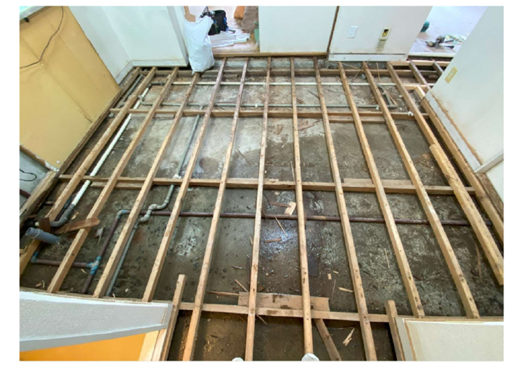 床を剥がしていると、濡れていることがよくわかります。また床の下には、このように配管がめぐらされていることも知らない人は多いのではないでしょうか。